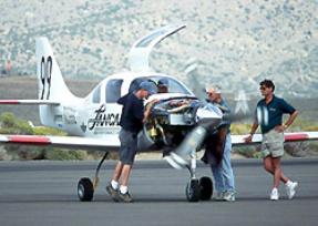 With 10 people grunting, we pushed enough on the hangar’s 100-foot-long door so one of us could squeeze an arm inside to hit the button and raise the door. We had 25 minutes to put the cowlings back on Carbon Dreams and get Dave on the runway. With no tug in sight (it was probably with the folks who had all the keys), we pushed the plane up the ramp to get to the taxiway... a very long push. As Dave took off, someone mentioned that this would be his first flight in Carbon Dreams. All went well, and he qualified at 325 mph, second in the field. Hallelujah! We were in the race, but somehow, somewhere, we had to find another set of “big boy” turbochargers. Thankfully, we had two days to figure that one out. First Heat The first heat race was at 3 p.m. on Thursday. The racers took off in Reno’s typical mountain desert weather - windy, hot, and turbulent. As they came down the chute, Race 25, Eggstra Special, Dave Anders’ Questair Venture, called a Mayday when its prop oversped and destroyed the engine, and set up for a landing on Runway 14. Laced with holes, grooves, and dips, this runway was in terrible condition as far as race planes are concerned. After making a beautiful dead-stick landing, a rut caught the airplane’ s nosewheel, breaking it off, and the Venture skidded for some distance. Just as we thought he was going to make it, the plane flipped upside down. Dave escaped with a few scrapes and bruises, a testament to the Venture’s strength and the pilot’s ability. But the beautiful race plane was destroyed. Several seconds later, Race 71, another Venture flown by Mike Dacey, hit some turbulence, breaking the landing gear up-lock. The gear came down, and Mike declared a Mayday. The pace plane confirmed that the Venture’s gear was hanging straight down, with the main wheels together, obviously not locked in full down position. Because Dave Anders’ flipped Venture had closed Runway 14, Mike had to circle until the race was over before attempting a landing (which was successful and didn’t damage his plane). Then Lou Meyer in Race 69, the Thunder Mustang, told Dave that Carbon Dreams was trailing smoke. When the cockpit filled with smoke, Dave declared the heat’s third Mayday - before the races had reached the back course! With the engine still running, Dave was able to land on the one remaining runway. Met by his disappointed teammates, the team returned to the hangar for another long night. Digging into the problem, it turned out that the new, bigger ADI water pumps we’d installed needed a 15-amp circuit breaker, not a 5-amp breaker. When the breaker blew, the pumps quit. And we already knew what happens when the ADI quits - two more blown cylinders, bringing the week’s total to eight. With more parts arriving the next morning, another long night of tear down and rebuild saw Team Lancair ready to race again on Friday morning. Race 99 didn’t quite have matching cylinders; it was sort of a hodgepodge, with the best of the old, some new, and lots of hope. But Carbon Dreams was wearing its new race cowling that fit the TCM TSIO-550 like tight jeans. We also scrounged up another “big boy” turbocharger to replace the ruined one. And Discovery Wings Channel installed its camera in the cockpit to film the race. So once again, we were ready to go racing, and race we did. First Circuit Friday’s race would be Dave’s first time around the new course because his Mayday took him out of the race before the first turn. RARA had modified the chute and entry procedures from previous years to make a longer run for the first lap only, and this will soon become meaningful. Sitting on the ramp with my timer board and radio on Friday afternoon, I was to time the laps and radio the time, resulting speed, and time interval from the nearest competitor to Dave on a discreet frequency. As Dave rounded the homestretch pylon, Carbon Dreams was howling toward me and going faster than I could ever remember. But the angle didn’t look right. Dave had made a mid-course mistake and missed two of the new course’s pylons. On the home straightaway, an imaginary line keeps the racers at least 1,000 feet from the crowd. It’s called the “deadline,” and crossing it is a bad thing. Dave realized his mistake as he came roaring into that last turn at far too sharp of an angle. To keep from crossing the deadline, he put both hands on the stick and pulled. Despite the 7-G turn, Carbon Dreams cut the deadline. Not giving up the race, Dave finished the remaining five laps and built a 25-second lead over the next plane, Lou Meyers in the Thunder Mustang. But the mistake was costly. Even with the 24-second penalty he was still the fastest, but the deadline cut automatically moved him to the last starting position in the upcoming Gold heat race. But we’d finally flown the course, the ADI was working, and the engine was running beautifully. The team breathed a big sigh of relief and left the hangar at a reasonably early hour after the obligatory oil change and cylinder check. But we also wondered how Dave would go about getting by everyone else in the Gold heat from the back of the pack. Disappointed with his performance, Dave did something about it. He studied the Discovery Wings Channel video to analyze the course and spot those new pylons. On Saturday, we were out of the hotel by 6 a.m. We got to the field and he climbed into the new Lancair Legacy that was on display, flew the chute and course entry, and found his correct course checkpoints. He’d not make the same mistake twice. Saturday’s Race Taking off into a windy sky at 3 p.m. on Saturday, the members of the Lancair Racing Team held their collective breath, and I said a prayer to the race angels. We started breathing again after hearing the magic words, “Gentlemen, you have a race,” over the loudspeakers as the racers flew down the chute. Hardly believing our eyes, Carbon Dreams streaked to the front of the pack before it r