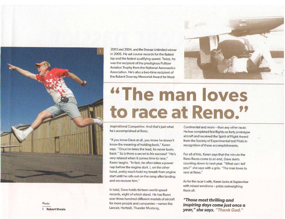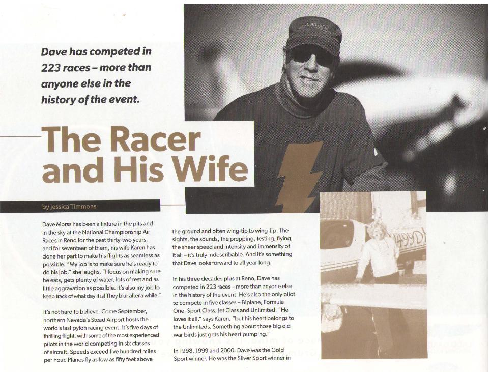 by Karen Morss Me: What time are you leaving tomorrow, Dave? Dave: Wheels up, 7am. Me: Isn't that a little early? Dave: Are you kidding me? There are seven planes there already. And so began our trip to Stead, Nevada for the 50th National Championship Air Races. This year had been fraught with challenges. But you know what they say, what doesn't kill you makes you stronger. We were thrilled just to be going. And especially honored by the story in the program, ‘A Racer and his Wife’. I arrived late Sunday afternoon. Dave had flown the course and scoped out the competition. As we drove to the hotel he told me, 'Earl (Hibler) got a new engine and I can't get past Tom (McNerney).' It was going to be an interesting week. Dave and Earl have been racing together for over 30 years starting in Formula One. They have flown some of the closest, most exciting races in the class. But Earl hasn’t been here for the past two years and we’ve missed him. Tom is a sophomore racer who has done an amazing job with Race 55, including some aerodynamic mods that have his 4-cylinder, Lancair 320 going faster than ever. Vicky Benzig and Colleen Keller are both racing Sport Class this year (a first to have two women in the class). I’m proud to call both friends. Qualification takes place on Monday and Tuesday, with some last minute quals Wednesday morning. Tom qualified on Monday at 268.272 mph. Dave and Earl qualify on Tuesday in what was one of the most exciting and memorable qualifications ever. That morning Earl told me, ‘I’m coming for him’ and did he ever. Keep in mind they were up there to qualify, not race. But race they did, displaying their awesome formation and racing skills. Dave held him off for the first two laps but Earl caught him on the third lap and passed him just before the home pylon. Dave qualified at 271.280 and Earl at 270.894. Let the racing begin or continue in their case. When the pairings came out we were a little disappointed. Earl and Tom would fly in the Bronze on Wednesday with Earl in the pole and Tom third. We would start at the bottom of the Silver on Thursday. You take what you get and do the best that you can. Doug Matthews asked Dave to be the alternate pilot for Rebel, a P51 Mustang racing Unlimited. There was a lot of paperwork to get through but they made it happen and on Wednesday Dave got to fly the Mustang. He qualified at 325 mph (bettering previous qual by 10mph) but would have to wait and see how events unfolded if he was to fly again. Earl won his first race with a speed of 276.279 faster than Baby Doll’s ever gone. Tom finished third at 268.300 and got the pole for the Medallion race. The Medallion race was for the bottom 8 planes. Tom won that race with a speed of 261.906. When I saw Earl after the race, I bowed in submission and said ’You’ve got him Earl. We can’t go that fast.’ He laughed and said, ‘We’ll see.’ I know and he knows that Race 99 can’t go that fast unless we get a race prop. But racing is racing and anything can happen (and usually does). One of the really fun traditions at the Air Races is the antique Fire truck that loads up the winning crew and pilot of each race and parades them in front of the grandstands. It’s a lot of fun for everyone especially when you go past Section 3, the most awesome, avid air race fans in the world. They hold up scorecards for each team rating their performance from 1 to 10. Both Earl’s and Tom’s teams got to ride on the Fire truck that day. It was great to see for both teams. On Thursday, we would start in the race in 8th position, tail end Charlie. As the form up unfolded, Vicky Benzig had to pull up to sort out some issues with her plane. When she rejoined, she was behind Dave. For the next six laps, she did everything she could to get past him. She’s quite a bit faster but it is very hard to pass in air racing. She told me after the race, she had learned more about passing in that race than any other. During a race, my job is to give Dave his lap speed and the interval of the plane behind him. He was holding Vicky off between 4 and 7 seconds until the final turn around lap 8. With the straightaway in front of her, she opened it up and passed him at the finish. In the excitement of the moment, I neglected to tell him she was coming. She finished with a speed of 267.221 and Dave at 267.199, only .049 seconds separating them. I must admit, I was cheering for Vicky in the last few seconds. It was a great race but he did chide me with a smile for cheering for the competition. The pairings came out for Friday. Pairings are set based on the previous race speed. Earl bumped up to the Silver and we bumped down to the Bronze starting third behind Tom with Vicky on the pole. There was no chance to get ahead of her this time. She took the lead at the start and held it the entire way. Dave tried everything he could to get around Tom but it just wasn’t working. He flew high, he flew low, he flew tight. He tried different RPM settings. But in the end, you need about 7 mph to pass in air racing and some luck too. He had neither that day. On the final straightaway, he tried to catch him but lost in another photo finish by .089 seconds. When we got back to the pits, he said, ‘I need six inches.’ And the crew went to work. Our crew this year was Justin Fluegel and Kyle Roh. Justin works for a subsidiary of Boeing, Insitu, and supports the U.S. Military operations all over the world. This was his first year crewing at Reno (and we hope the first of many). This was Kyle’s second year so when he showed up Friday, he knew the drill. They started by cleaning and polishing every inch of the airplane before taping the wings. Once that was done, Kyle suggested winglets to cover the nav lights on the wing tips. Kyle works in the wind tunnel at NASA so he understood the advantage even a small change like this could have on the plane. He got to work constructing the winglets with the materials w