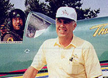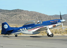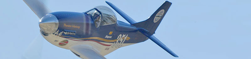 Where did this plane come from and how did I get to be the lucky one to play with it? I met Dan Denney several years ago and worked with him on the testing and subsequent redesign of the Kitfox IV Speedster. During this program he showed me a picture of an engine and told me of this next project. I must admit to being a bit skeptical as many had tried to capture the aura of a Mustang, but no one had really succeeded. Years ago I joined a club in California that had a Mustang and a T-6. It was truly a great adventure but the cost and logistics were just too much and I sold my share. Now I’m really lucky as my friend Jerry Gabe lets me fly is rare A-model Mustang. My doubts about Dan’s plane increased when I got to fly the Stewart Mustang at Oshkosh two years ago. The S-51 was a blast to fly. It felt like a Mustang and even though the performance was not quite as inspiring as the full size airplane, I figured it should fill the needs of those wanting a scale P-51. Fortunately for all of us, Dan pushed on and has created a plane that has a mystique all its own. I’m constantly amazed at the enthusiasm this plane garners wherever it goes. At Oshkosh and Reno the Thunder was displayed next to the Legend, and even though the Legend was flying and the Thunder was just a static display, there was a sense of something special about the Thunder Mustang. Personally, I don’t think that anyone could look at that Falconer V-12 engine installation and not be awed. It just looks right – like an engine truly made to fly. This is a theme that runs throughout the project: don’t just make it right, make it the best possible. For example, this is the only composite kit I know of that has no wet layups. Because of the use of carbon molds, the parts are so exact you just Hysol them together. Even though the cores are an aluminum honeycomb, which is really state-of-the-art, Dan is now incorporating a process to anodize the core so it could pass the Navy corrosion tests. Now, how much salt the core is going to see sandwiched between carbon skins, I don’t know. As the date for the first flight approached, Dan and I decided to tow the airplane to Boise International Airport for the first flights. Because we were testing a new engine and a new airframe, we wanted all the advantages of Boise: a longer runway, no city at the end of the runway and advanced crash/fire rescue capabilities. We decided to do the first few flights in Boise with our engineering test personnel before our first pubic flight back at Nampa. Before the first flight, I was treated to a new experience. Ryan Falconer, who designed the engine, came out to do the last minute tweaking on the installation. I sat in the cockpit while he sat at a table next to the plane with his laptop computer. He would ask me to run at such and such rpm, then he’d look at the timing, fuel flow, etc., and make small changes to the parameters and transmit the changes to the engine. The engine just kept getting smoother and smoother, yet not a wrench or screwdriver was anywhere near it. This engine even has the capability of telemetry where ground observers can see real time what’s happening as I fly by. Ryan says that the unit is also capable of receiving changes in the air from the ground, but because of the consequences of a bad keystroke, we have not tested this feature. We can, however, download the data and phone link it to Ryan and have him modem changes back to us to reload into the onboard computer. So how does it really fly? Let’s go for a flight and I’ll point out some of the unique things about the Thunder Mustang. First off, just starting the engine is different. There is no mixture control, no primer, no carb heat or alternate air; just turn on the master and ignition and hit the red button. The computer will determine if it’s a hot start or if you’re at a high altitude airport and akjust the timing and enrichment as required. This engine is really silky smooth. As you taxi out, a slight S-turn is required to clear the area directly in front of the nose. To maneuver in tight areas, just as in the full size Mustang you push the stick forward of neutral and the tail wheel unlocks for full swiveling. In the runup area, set coolant and oil doors, set trims to zero (there isn’t that much torque) and you’re accelerating so fast that the rudder is best just left at “0”), flaps up, bring the power up to 3,000 rpm, cycle the propeller a few times and then turn off the left engine. The Falconer V-12 is built and installed as if it were two six cylinder, inline engines, each with an independent computer for ignition and fuel injection, that just happen to share the same crankshaft. This is an area that makes no sense to me. How can you turn off six cylinders and have the engine still stay smooth as silk? Maybe Ryan can explain it. Anyway, the rpm will drop to 2,200; then return to “Both”; and then turn off the right six and see it also drop to 2,200. Now a final check around the cockpit and we’re ready to go. Acceleration isn’t really the term to describe the launch of the Thunder Mustang. You fly off at about 90 mph, select gear up and keep pulling back to stay below 150 mph until the inner gear doors close, then stop pulling back and you’re at 175 mph, which is your best rate of climb speed. Several times I’ve pegged the VSI and it goes to 6,000 fpm. That’s 60 miles per hour vertical speed. One oddity of the climb is that you can’t get a steady manifold pressure reading because the Vision Micro Systems, a neat box with all the engine gages in an LCD display, reads to the tenth of an inch and you’re losing five inches every minute in climb and the tenths just keep scrolling by. As you level off for cruise, usually within three minutes of take-off, the speed builds rapidly and at 65% power at 10,000 feet, the true airspeed is 308 mph burning just 25 gallons per hour. The plane is very stable solo and at full aft CG it 